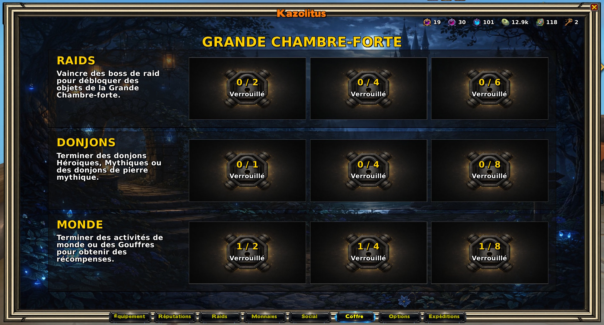 Plus besoin de retourner en capitale pour vérifier votre avancement hebdomadaire. Kazolitus intègre l'interface de la Grande Chambre forte directement dans votre menu :