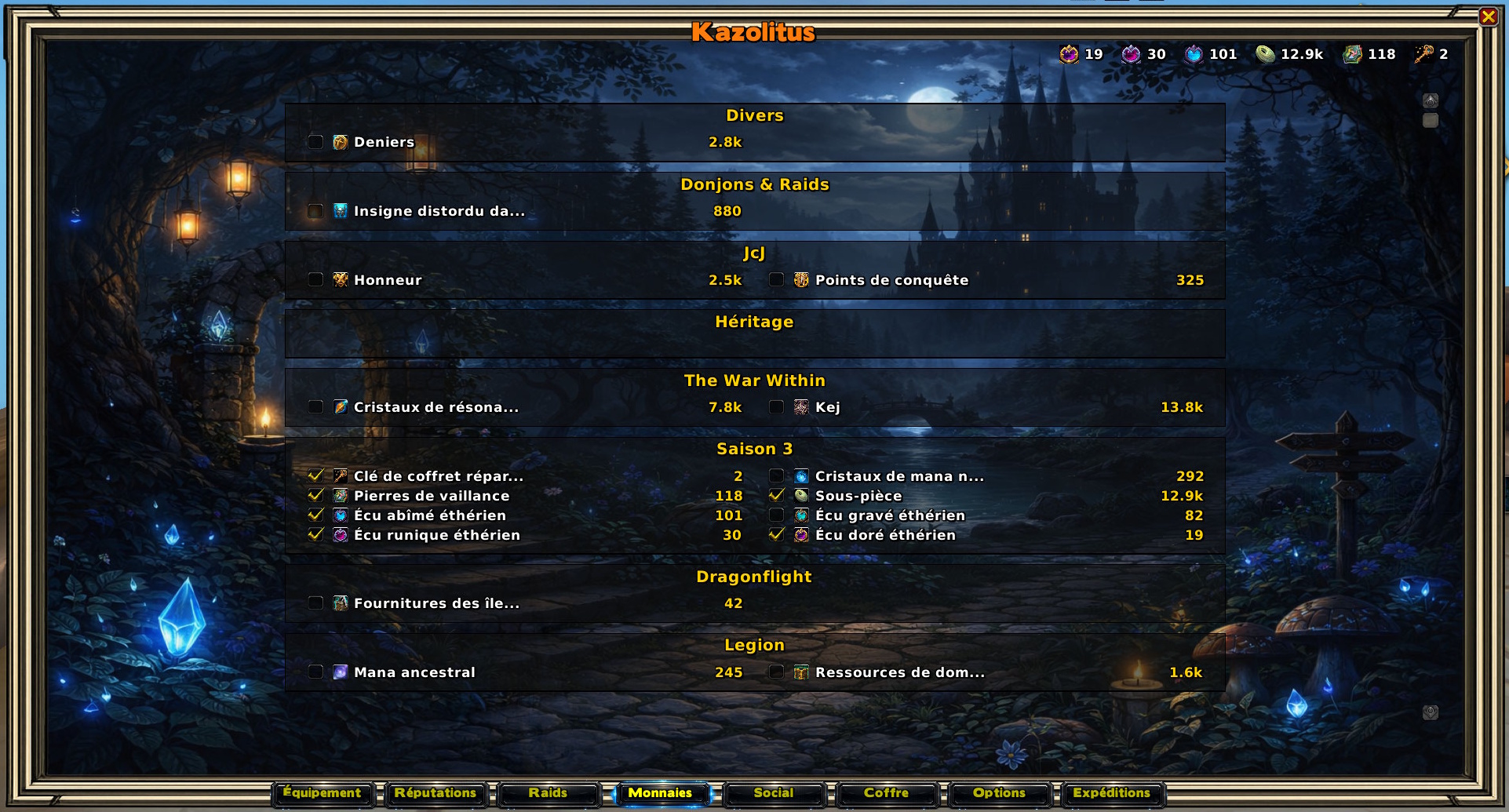 Note importante : L'affichage et le suivi des monnaies nécessite l'installation préalable de DataStore https://www.curseforge.com/wow/addons/datastore et Altoholic https://www.curseforge.com/wow/addons/altoholic (disponibles sur CurseForge).