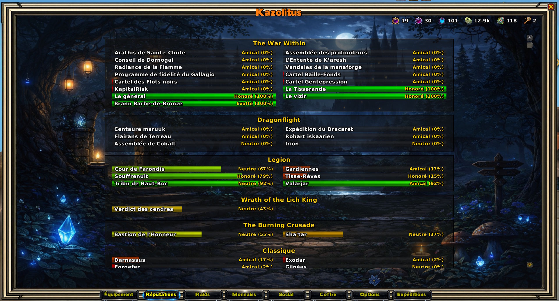 Réputations : Vos barres de faction sont organisées proprement par extension pour une lecture facile.
